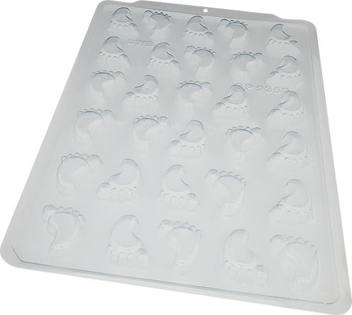 1 részes csoki öntőforma, babatalp, 24x36 cm. A forma 30 db 4x3 cm-es talpat tartalmaz. Készítsen egyszerű, mégis aranyos csokoládét könnyedén ezekkel a csokoládé öntő formákkal. Használja sütemény díszeként vagy csak mulatságos édességként partikon. A formából könnyen eltávolítható a kész csokoládé termék, de használható cukormasszával vagy modellcsokoládéval is. Használat után mossa el meleg szappanos vízzel és törölje át ecetes vagy citromos papírtörlővel, hogy ne maradjon vízkő foltos. Újra és újra felhasználható!
