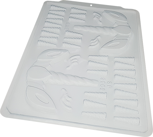 1 részes csoki öntőforma, unikornis szett, 24x36 cm, fül-szarv (14X13 cm), szemek (4,5x2 cm), és 30 db 4 cm-es apró szarv muffinhoz. Készítsen egyszerű, mégis aranyos csokoládét könnyedén ezekkel a csokoládé öntő formákkal. Használja sütemény díszeként vagy csak mulatságos édességként partikon. A formából könnyen eltávolítható a kész csokoládé termék, de használható cukormasszával vagy modellcsokoládéval is. Használat után mossa el meleg szappanos vízzel és törölje át ecetes vagy citromos papírtörlővel, hogy ne maradjon vízkő foltos. Újra és újra felhasználható!