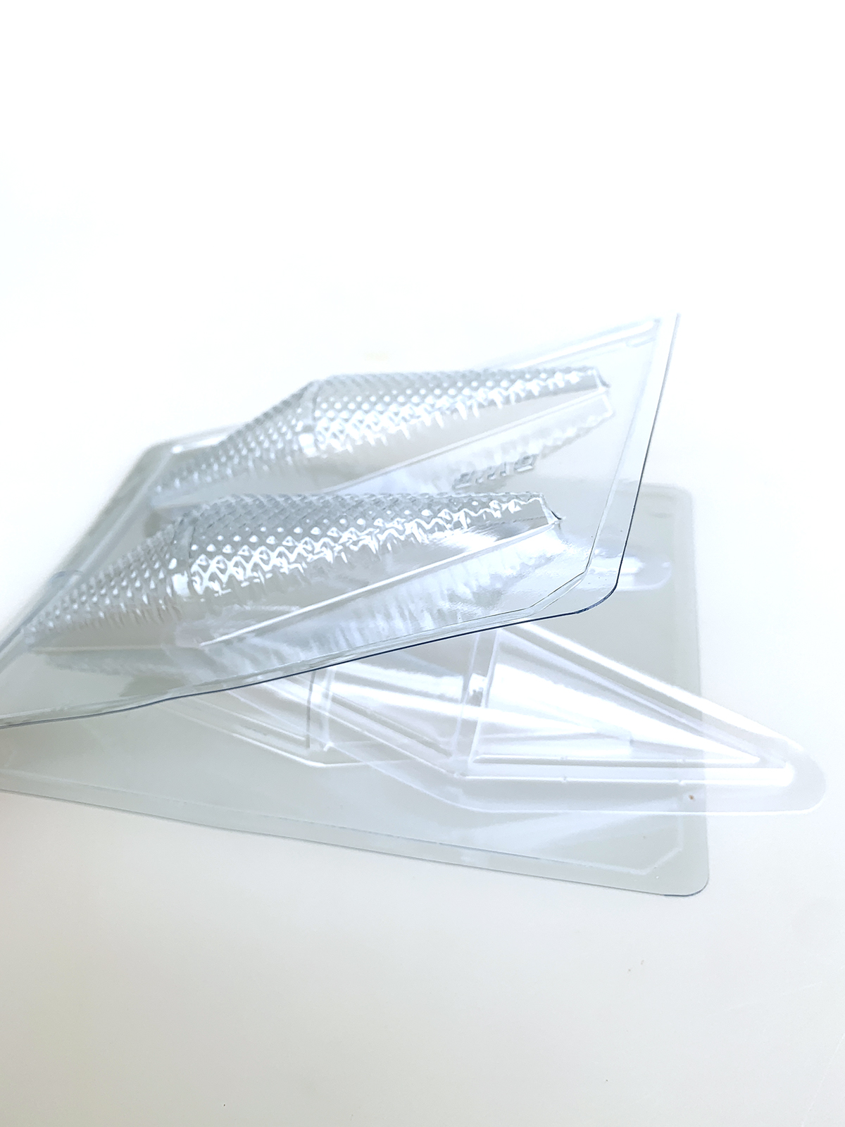 3 részes csoki öntőforma, fagyitölcsér, 21x17 cm, a formában 4 tölcsér van, egy mérete: 9,5x4,5 cm.
