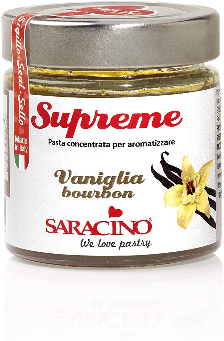 Bourbon vanília természetes sűrítmény magokkal, 200 g. A Saracino Vaniglia egy bourbon vaníliából származó sűrítmény, mely magokat is tartalmaz. alkalmas bonbonok töltelékének, sütemény krémek ízesítésére, vagy egyben süthető a süteményekkel, mivel hőstabil. Alkalmas még fagylaltok, ganázs, párizsi krém, macarom krém, muffin, vajkrém, vagy mascarpone krém ízesítésére is. Használat előtt felkeverendő.