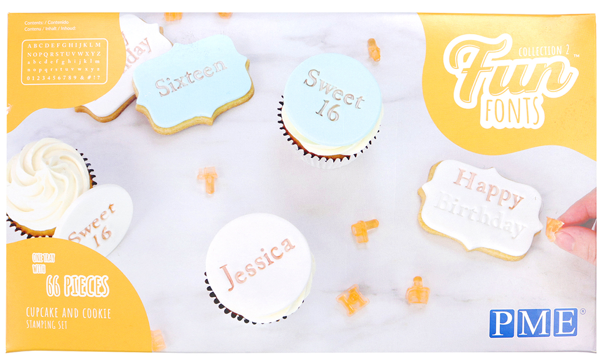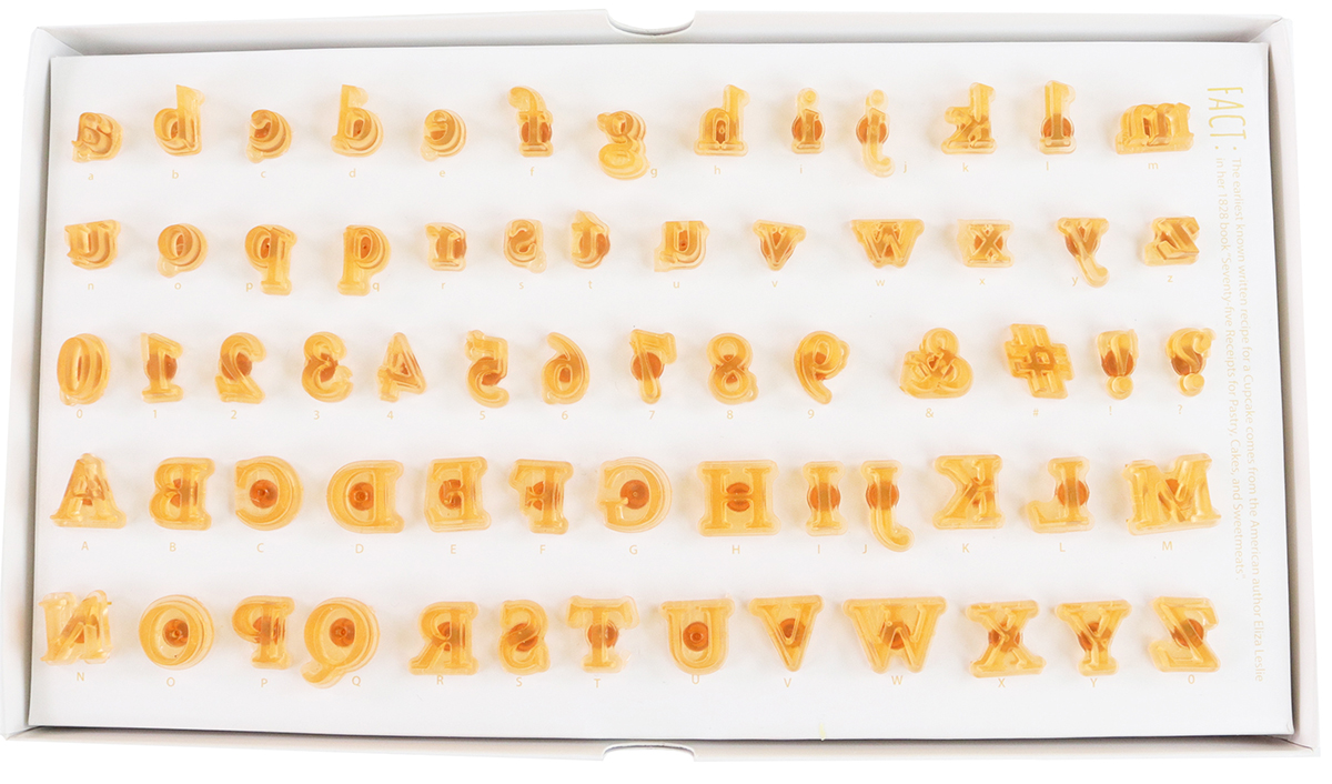 Fun Fonts betűnyomda szett San Serif betű tipussal, kicsi, kekszhez, muffinhoz, mely lehetővé teszi új, divatos betűk egyenkénti benyomását akár fondantba, akár marcipánba, akár modell csokoládéba. A benyomott felirat utána könnyen dekorálható, festhető, glazúrral kitölthető, vagy akár csillám por is bele szórható, szóval a határ a csillagos ég. A szett tartalma: 26 nagy- és 26 kisbetű, 0-9-ig számok, és &; !; ?; # szimbólum. Anyaga átlátszó műanyag, így könnyen pozicionálható. A dobozt tárolóként is használható, a könnyű tisztán tarthatóság végett. Kiváló minőségű élelmiszer barát műanyagból készült.