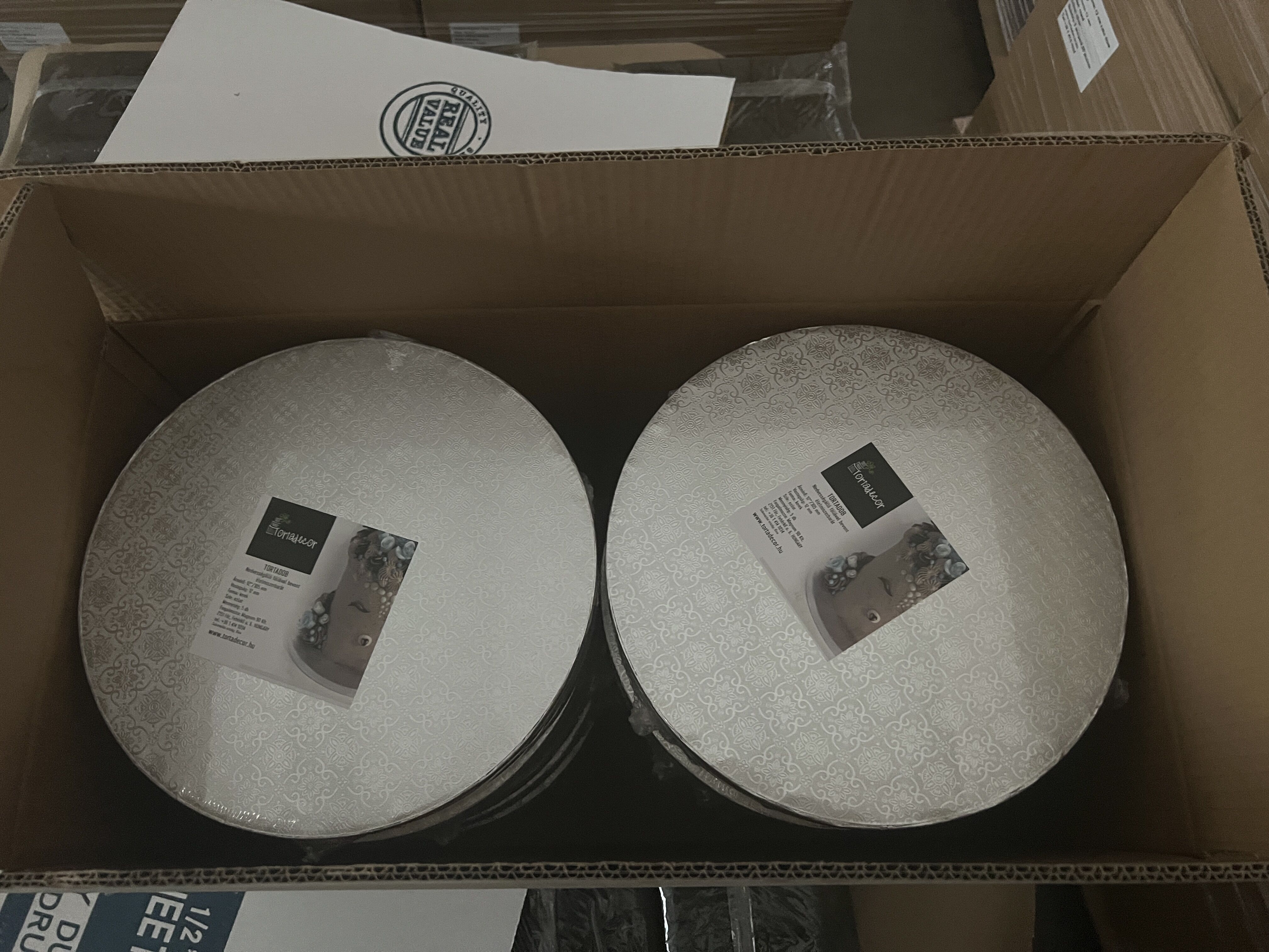 KARTONOS Tortadob, kerek, 355 mm, 12 mm, fehér, 50 db/cs @ 450 Ft/db. Élelmiszerbarát fóliával bevont részére közvetlenül rátehetjük a süteményt, de színes vagy mintás fondant-al bevonva, széles szalaggal díszítve az élét igazán feldobja a tortát.