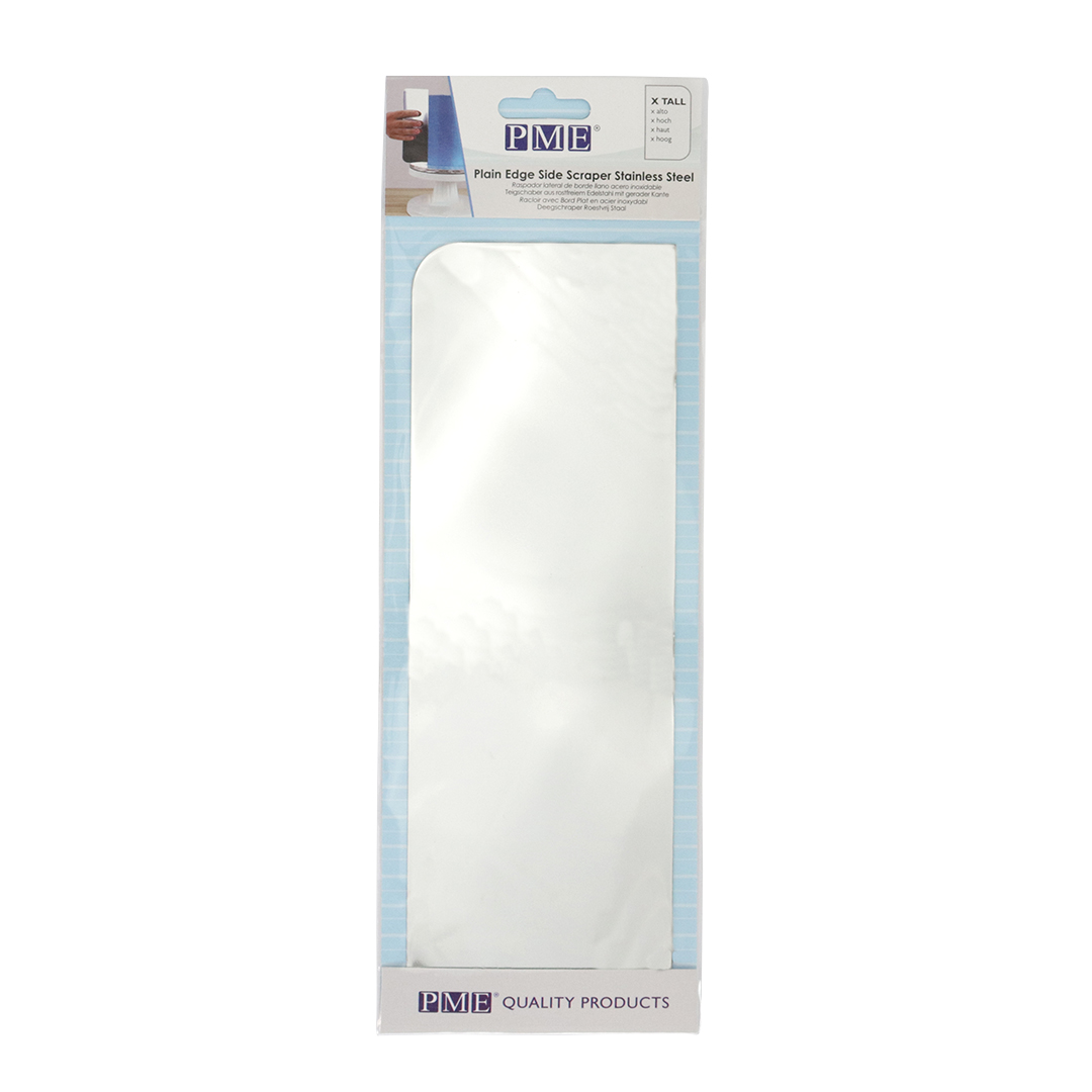 Rozsdamentes élsimító, torta oldal lehúzó, 250mm x 88 mm, tartós, könnyen tisztítható. Alkalmas vajkrém, ganázs, glazúr elsimítására. Akril torta alátéttel könnyen használható.