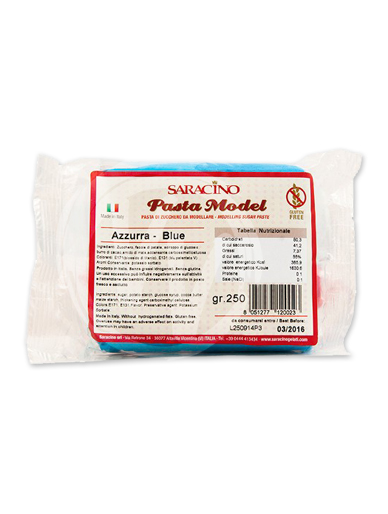 Saracino modellező cukormassza figurákhoz, Azure, 250g. Kitűnő modellező tulajdonságokkal bíró cukormassza figurák készítéséhez, mely külső felülete gyorsan keményedik, de nem szárad, ami azt jelenti, hogy még 1 napi száradás után is az anyag újra felhasználható minden gond nélkül. Tulajdonságai fokozása érdekében érdemes modellcsokoládéval keverni, így a két anyag egyesíti pozitív tulajdonságait. A massza a csomagolásban keménynek tűnik, de egy kis gyúrás után lágy és jól nyúló lesz. Összetevők: cukor, burgonya keményítő, glükóz szirup, kakaó vaj, kukorica keményítő, térfogat növelő: karboximetil cellulóz, színezék. Hidrogénezett zsírt nem tartalmaz, glutén mentes.
