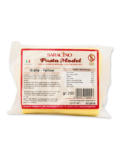 Saracino modellező cukormassza figurákhoz, Sárga, 250g. Kitűnő modellező tulajdonságokkal bíró cukormassza figurák készítéséhez, mely külső felülete gyorsan keményedik, de nem szárad, ami azt jelenti, hogy még 1 napi száradás után is az anyag újra felhasználható minden gond nélkül. Tulajdonságai fokozása érdekében érdemes modellcsokoládéval keverni, így a két anyag egyesíti pozitív tulajdonságait. A massza a csomagolásban keménynek tűnik, de egy kis gyúrás után lágy és jól nyúló lesz. Összetevők: cukor, burgonya keményítő, glükóz szirup, kakaó vaj, kukorica keményítő, térfogat növelő: karboximetil cellulóz, színezék. Hidrogénezett zsírt nem tartalmaz, glutén mentes.