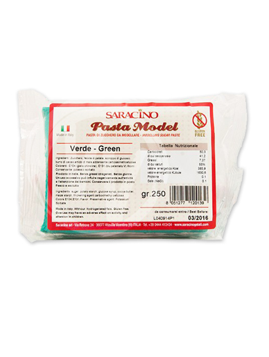 Saracino modellező cukormassza figurákhoz, Zöld, 250g. Kitűnő modellező tulajdonságokkal bíró cukormassza figurák készítéséhez, mely külső felülete gyorsan keményedik, de nem szárad, ami azt jelenti, hogy még 1 napi száradás után is az anyag újra felhasználható minden gond nélkül. Tulajdonságai fokozása érdekében érdemes modellcsokoládéval keverni, így a két anyag egyesíti pozitív tulajdonságait. A massza a csomagolásban keménynek tűnik, de egy kis gyúrás után lágy és jól nyúló lesz. Összetevők: cukor, burgonya keményítő, glükóz szirup, kakaó vaj, kukorica keményítő, térfogat növelő: karboximetil cellulóz, színezék. Hidrogénezett zsírt nem tartalmaz, glutén mentes.