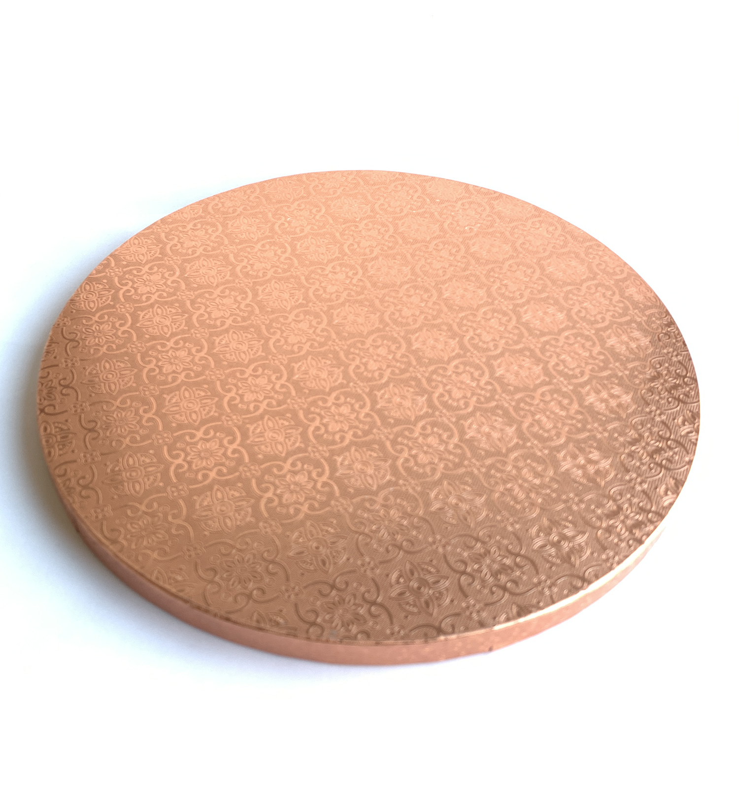 Tortadob, kerek, 305 mm, 12 mm vastag, rosegold. Használhatjuk így is, de színes vagy mintás fondant-al bevonva, széle szalaggal díszítve igazán feldobja a tortát.