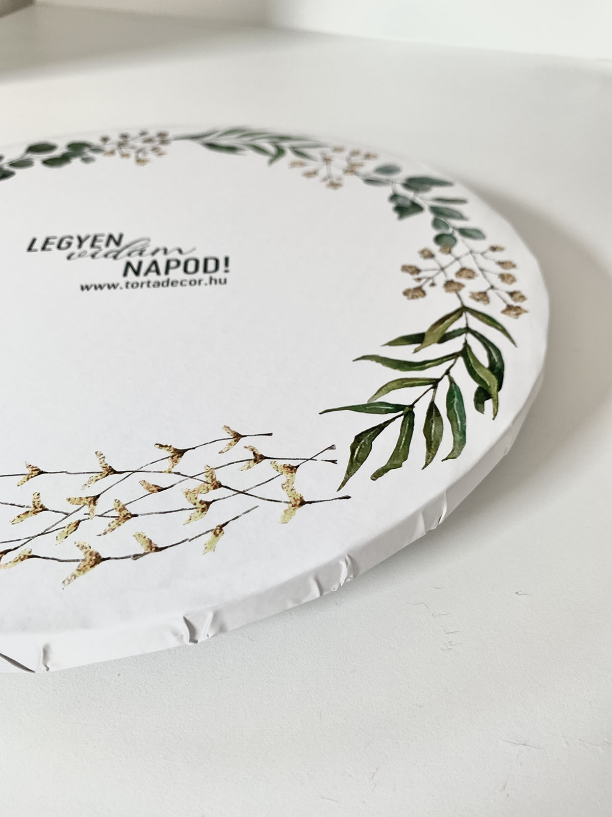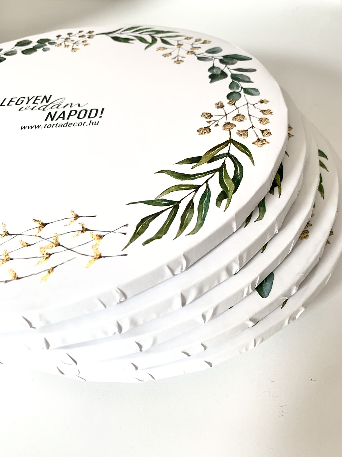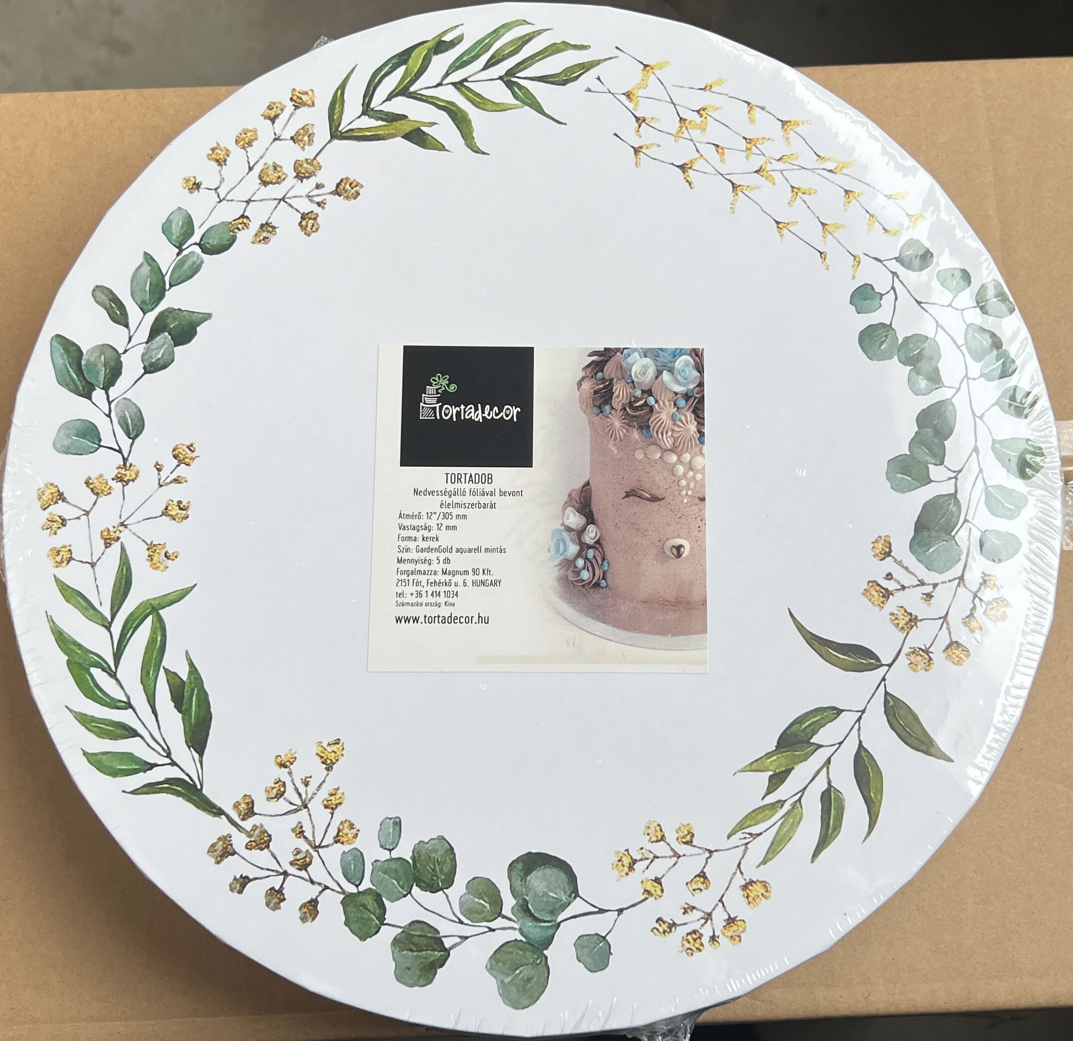 Tortadob, kerek, 305 mm, 12 mm vastag, Vintage, 5 db/cs @ 610 Ft/db,kedvező áron, tortadecor.hu logo-val. Élelmiszerbarát fóliával bevont részére közvetlenül rátehetjük a süteményt, de színes vagy mintás fondant-al bevonva, széles szalaggal díszítve az élét igazán feldobja a tortát. 5 db / csomag