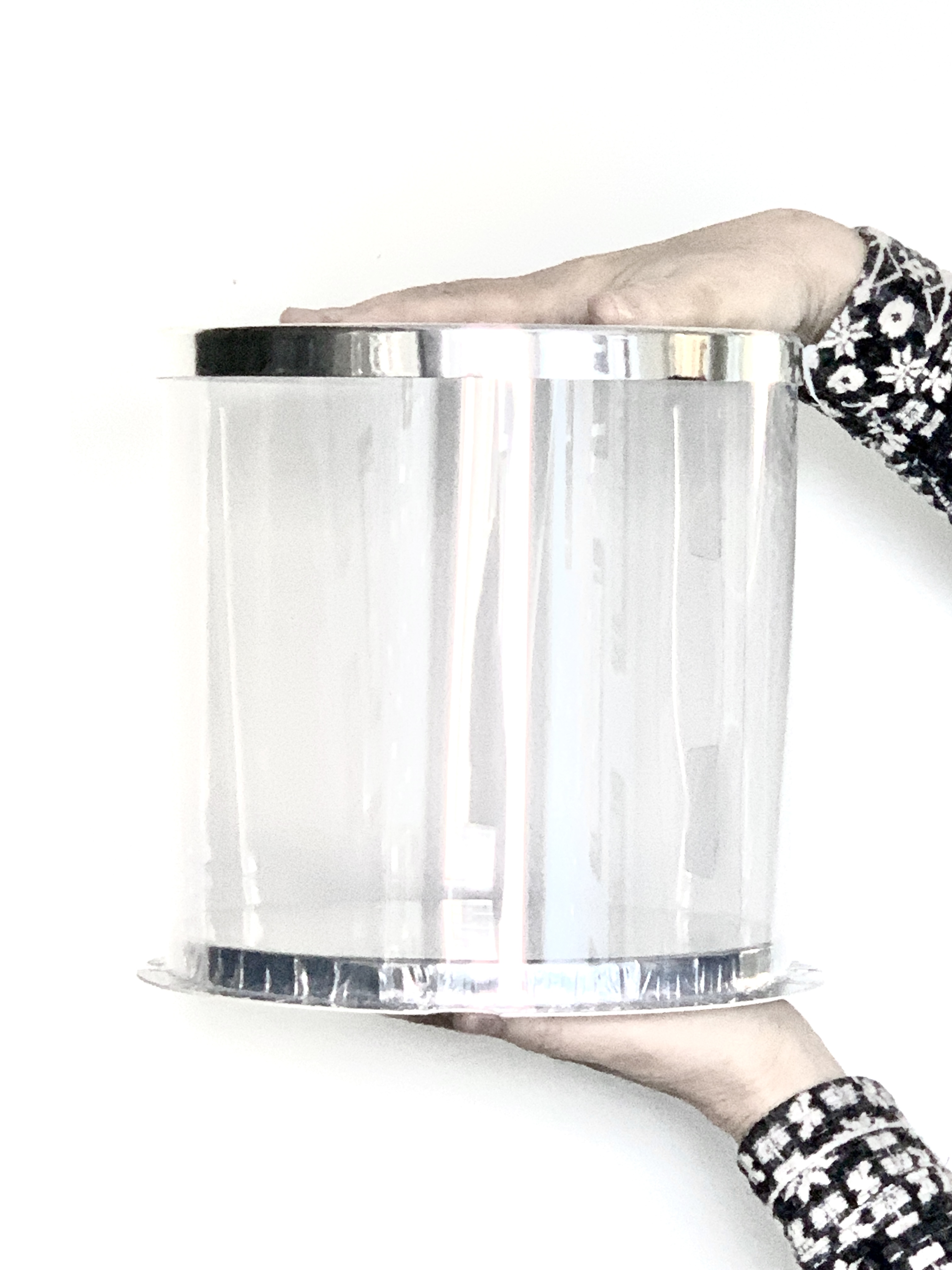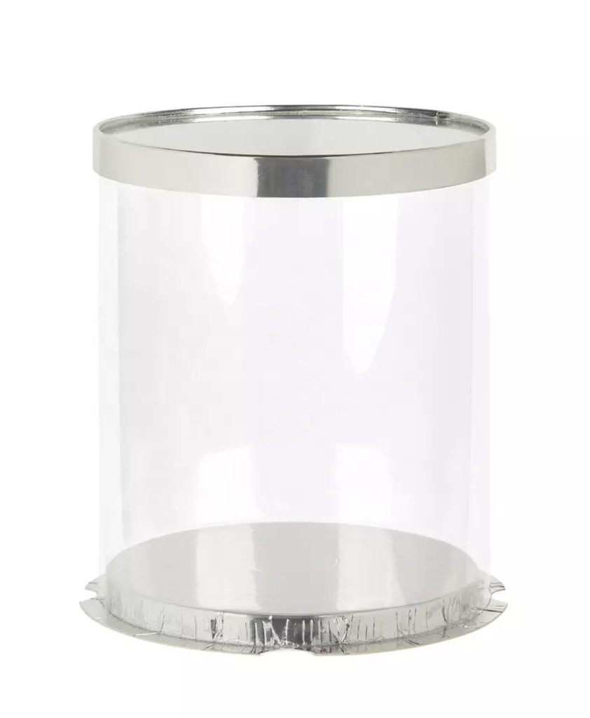 Tortadoboz, kerek, átlátszó, ezüst talppal, 26x26x31 cm, PVC műanyagból, modern, esztétikus kivitel. A csomagolás a szalagot nem tartalmazza.