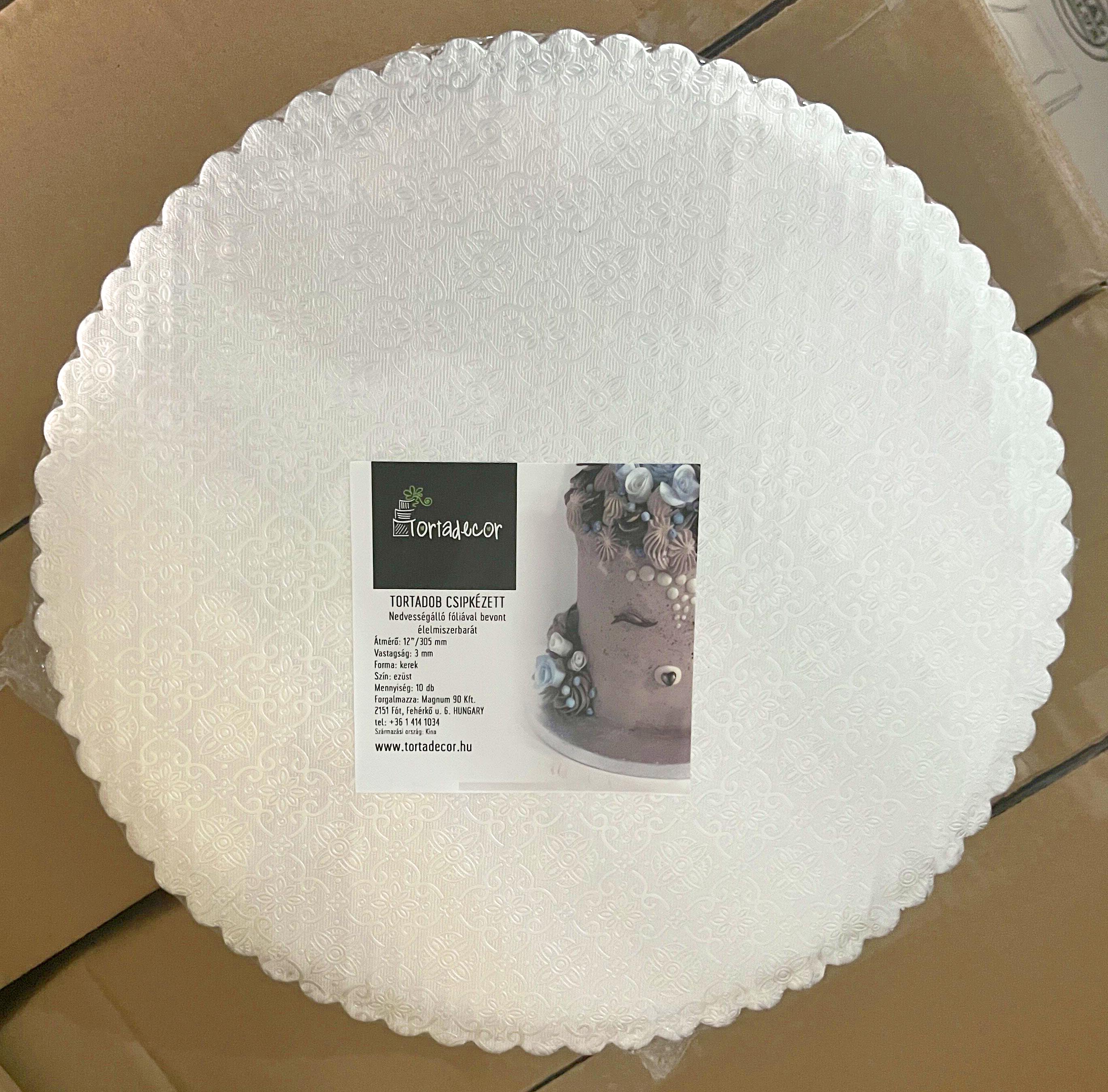 Tortakarton, kerek, 254 mm, 3 mm, ezüst, 50 db/cs @135Ft. Kartonból készült tortatálca, hullámos szegéllyel, élelmiszerbarát fólis bevonattal. Kedvező árához képest meglehetősen erős, akár nehezebb tortákhoz is megfelel.